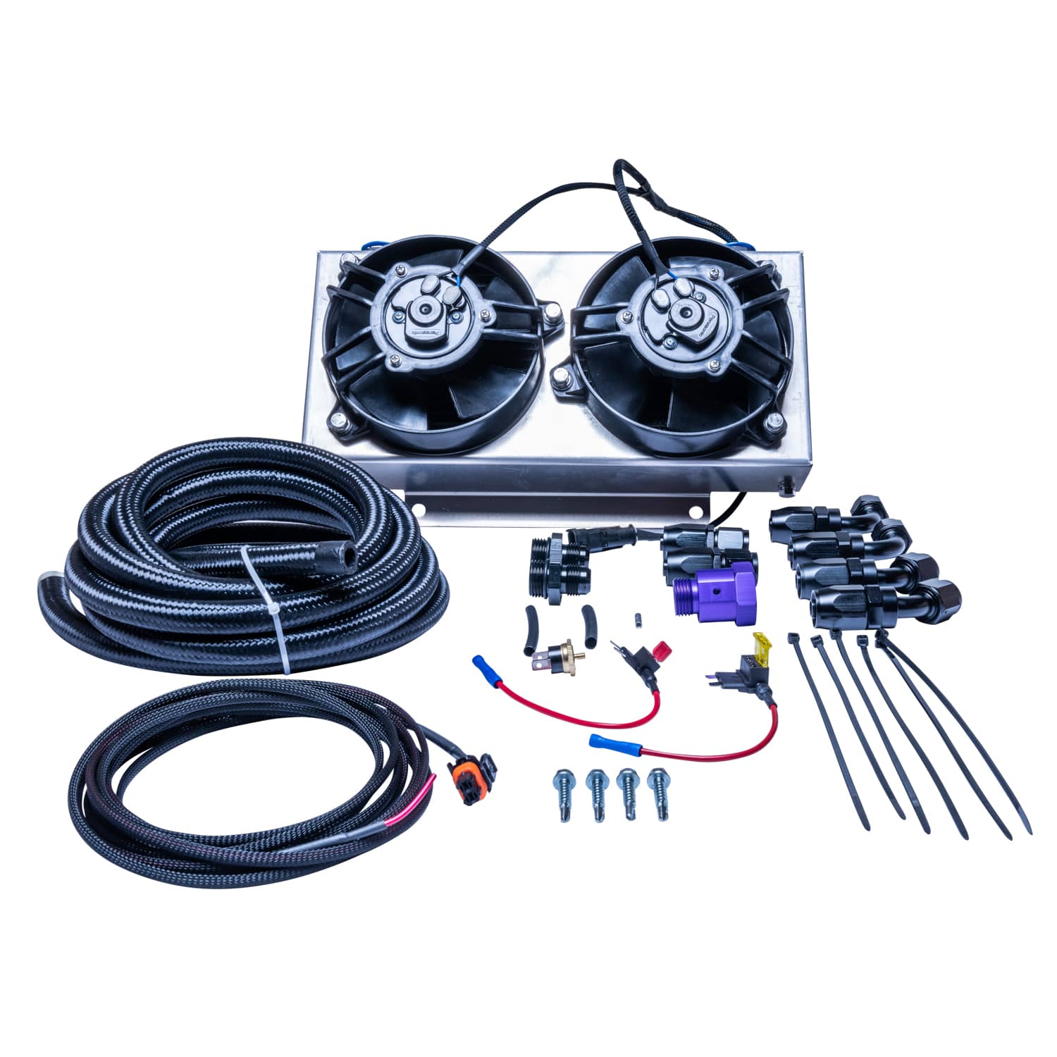 - 310-903-2000 - 19 Row Cooler with Double Fans: Cooler with fans measuring 7.875 Inch x 13 Inch x 5 Inch. Includes 2 6ft -8AN (1/2 Inch) nylon stainless steel braided hoses and an assortment of -8AN (1/2 Inch) fittings.